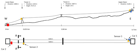 Descriptive figure of the structure and location of the sensors. This figure shows no operations with the two cars on their bases.