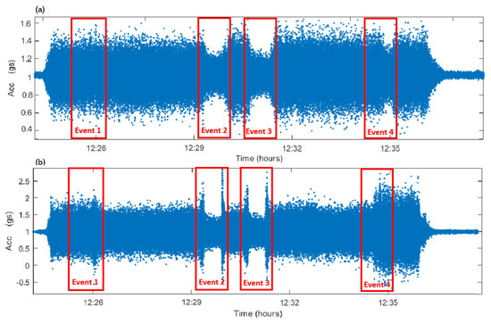 Vertical axis acceleration values recorded during flight 11 by the Car 1 (a) and the Tower 1 (b) sensors.