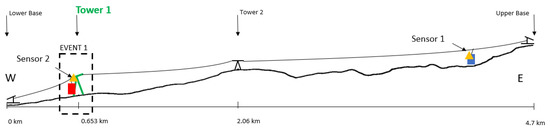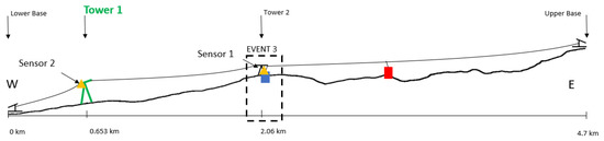 Event 3 (Figure 12). Car 1 rides downhill and crosses Tower 2. The data observed show a similar response to the data in Event 2. It is worth mentioning that, similar to Event 2, Car 1 (Sensor 1) data decrease in amplitude. Based on the data, the acceleration of the car depends mostly on the speed of the cable.