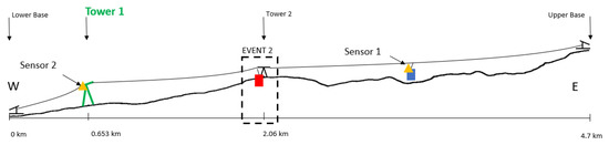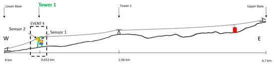 Event 4 (Figure 13). Car 1 rides downhill and crosses Tower 1. The acceleration recorded by Sensor 1 (Car 1) decreases. The acceleration recorded by Sensor 2 (tower) increases. The increase in acceleration amplitude in Sensor 2 is generated because Car 1 is now carried from the portion of the cable between the lower base and Tower 1.