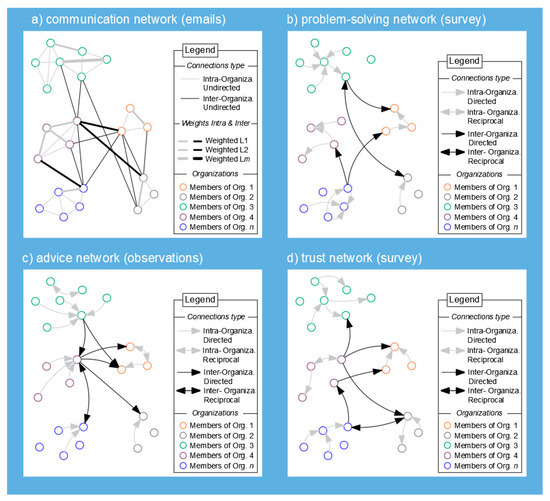 The four critical networks of the proposed model in this work: (a) communication, (b) problem-solving, (c) advice, and (d) trust.
