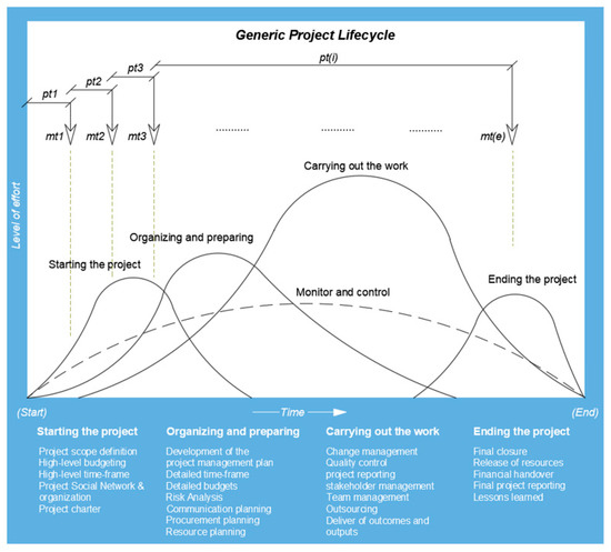 In Figure 3 are illustrated the four typical different phases of a project lifecycle proposed by the PMI [4], and the respective expected level of effort for each one of the different project phases. The four project phases are: (1) starting the project (where the project scope, definition, and project charter are defined), (2) organizing and preparing (where the development of the project begins in all the its different dimensions, ranging from budgeting, to risk analysis, to resource planning, just to name a few), (3) carrying out the work (which is the execution of what has been planned, but also complementing support activities such as change management, quality control, and stakeholder management, just to name a few), and finally (4) ending the project (which comprises the final project activities, such as financial handover, release of resources, and collection of lessons learned, just to name a few).