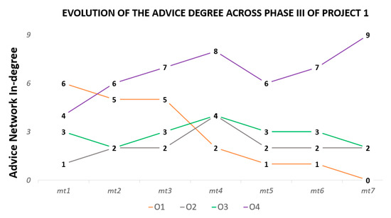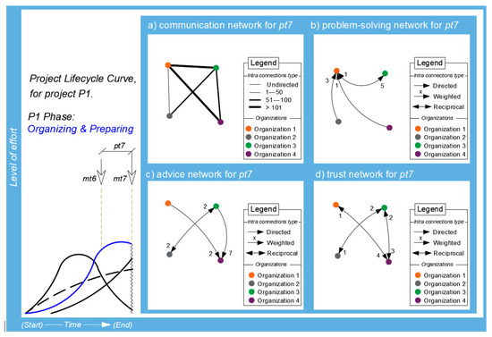 Advice-related data was collected through a set of daily observations, conducted by elements of the network analytic team of Organization A, of all of project 1’s stakeholders across pt7. The respective network is illustrated in Figure 4c. To create and later map this network, on-site observations targeting personal communication (face-to-face (F2F) small talk and project-related meetings) were recorded, aiming to capture interactions regarding the search for advice and guidance related to project tasks and activities. For example, these observations comprise the search for help from a project stakeholder regarding a project activity or task within the period pt7.
