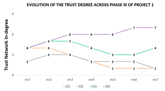 As can be seen in Figure 6, the trust network has a lower variability across time when compared with the previous longitudinal analysis on the advice network. This only reflects the reality regarding trust: it takes time to gain, but it can be lost very fast. As we move along project 1’s preparing and organizing phase towards its end, it can be observed that organization 4 has increased its trust level in a very sustainable way. Once again, organization 4 has been gaining a very central position within the project social network regarding trust, namely from mt2 onwards. Simultaneously, but in the inverse direction, organizations 1 and 3 have become more peripheral within the project 1 trust network. As previously said, trust is a fundamental pillar to effective collaboration, and as can be observed in Figure 6, it seems that there is a low level of trust between all the organizations that participated in the accomplishment of project 1 in the organizing and preparing phase. Such a behavioral shift regarding the trust network may represent a threat to the stability of the project’s social network, as mentioned before. In this case, organization A should take into consideration a further analysis (follow-up assessment) to uncover the real reason(s) that led to the observed dynamic behaviors illustrated in Figure 6, and if necessary, consider the implementation of corrective or supportive measures aimed at the creation of trust among project 1’s different stakeholders, to increase the chances of project success.