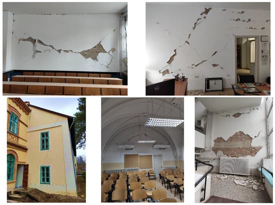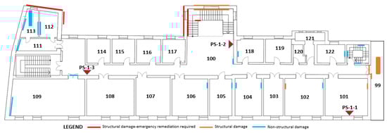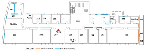The 2nd floor and attic suffered minor damage. Particular attention should be paid to the central part of the building, occupying the wing with the staircase. The formation of cracks on the central wing transverse walls is clearly visible, indicating a possible failure mechanism out-of-plane of the entire wing. A wedge was made, and the cracks were interconnected and propagated inside the building (they also appear in the stair beams). There was no displacement of the walls out-of-plane, but the preconditions for its failure were met. The central wing needs to be strengthened as soon as possible as part of the entire building’s renovation.