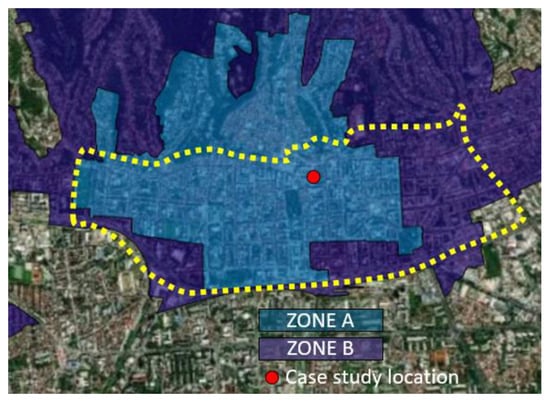 Protected zones A and B with the location of the case study inside the Lower Town of Zagreb (yellow dashed line).