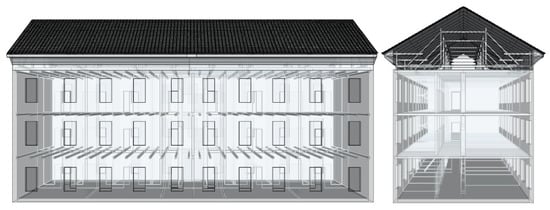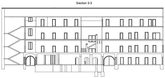 The subject of this paper is a building (Figure 4 and Figure 5) located at Vlaška Street 38 as an attached building inside a block. Today’s building was built in 1895 by adapting and upgrading two one-story buildings that were built in the early 19th century. The building was upgraded in 1906, while the building’s current shape established complete reconstruction in 1997. The building was retrofitted in 1997 for educational purposes and seismic strengthening was not implemented. The building has a rectangular ground plan with the main orientation, which is the longer side of the building in the east-west direction. The building’s external dimensions are 12 × 53 m, with two wings: one, 4.4 × 7.6 m and the other, 4.2 × 5.4 m located at the south side of the building. The total floor area of the building is approximately 685 m2. The building consists of a basement, first, second, third floor and attic. According to the Croatian seismic hazard map [24], the building is located in the area of peak ground acceleration intensity of agR = 0.255 g for a return period of 475 years. The building serves as an educational-scientific institution. The condition of the building before the earthquake, regarding the vertical loads, was satisfactory, and the building was regularly maintained.