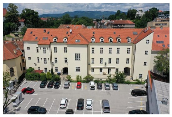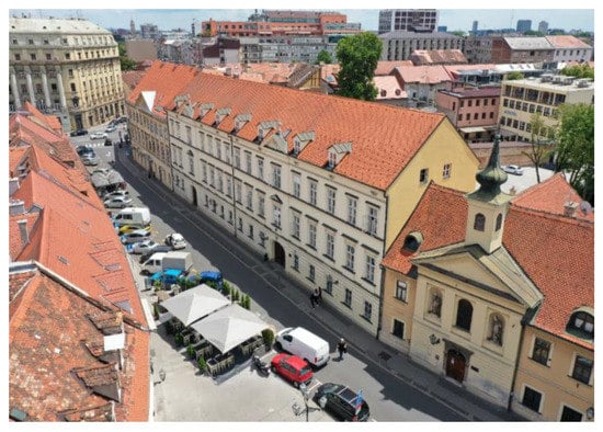 On 22 March 2020, at 6 h 22 min, Zagreb Metropolitan area was hit by an earthquake of medium magnitude ML = 5.5, and intensity of VII, in the epicenter, according to the EMS-98 scale [1]. At 7 h 1 min followed the strongest subsequent earthquake of magnitude ML = 5.0 and intensity of VI. The main earthquake damaged most of the buildings in the Lower Town, including residential buildings, universities, schools, kindergartens, hospitals and public buildings. The vast majority of buildings built after the first mandatory earthquake regulations in former Yugoslavia (1964) [2,3] either remained intact or suffered small damage. Nonetheless, the larger part of the city’s historical center (Upper and Lower Town) was severely damaged because the buildings in the center were built before any seismic regulations. The damage to historical buildings is enormous. Numerous museums, churches and university buildings have been severely damaged (Figure 1). At the end of the year, Croatia was hit by another devastating earthquake with an epicenter in Petrinja, located approx. 50 km from Zagreb (ML = 6.3). The quake caused subsequent damage to already damaged buildings, but to a lesser extent.