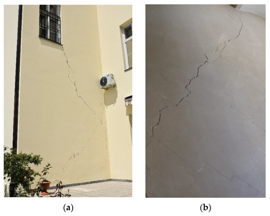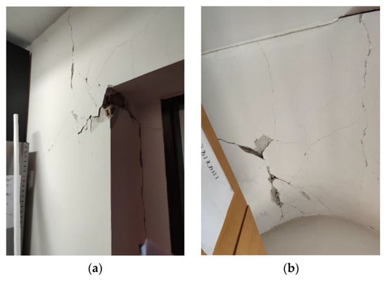 The second floor and attic suffered minor damage, while the most severe damage is found on the eastern (Figure 12a,b) and central staircase wings (Figure 13a,b). Recommendations were given that the building can be used with a restriction in the zones where there is a danger of plaster falling. Additionally, the eastern and western staircase can be used with a restriction in the number of people, while the central staircase is not to be used until a detailed assessment is conducted.