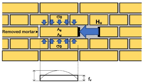 The shear strength of the masonry was obtained based on the registered horizontal force Humax acting on one brick at the time of reaching the shear strength in that brick and the corresponding mortar area on both sides of the shear is transmitted (Ag + Ad). The test method can be seen in Figure 17 and photographs (Figure 18 and Figure 19).