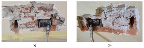 Masonry shear strength tests at measuring positions PS-1-1 (a) and PS-1-3 (b) on the 1st floor (photo credit: L. Lulić).