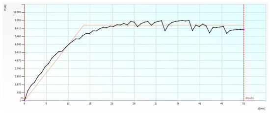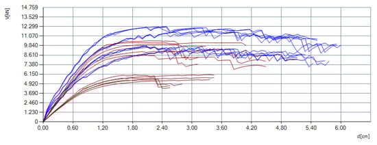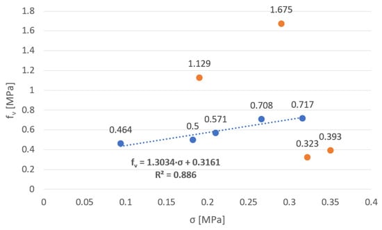 It can be seen from the diagram that the shear strength without vertical pressure is 0.316 MPa and that coefficient of friction is 1.303. Due to the high value in comparison to EC standard recommendation, the friction coefficient was taken as μ = 0.40 (according to [34]). The obtained shear strength of masonry without vertical pressure, i.e., cohesion, is higher than the one provided by the regulations for the case when there are no tests (fvm0 = 0.32 MPa > 0.10 MPa). The results show that the quality of masonry is good in contrast to similar buildings from that period.