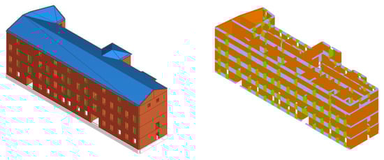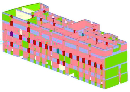 The 3D numerical model of the assessed building is obtained in 3Muri software. The macro-element approach is adopted due to computational efficiency and high precision [35]. Its versatility in modeling (implementing elements of various materials, realistic floor stiffnesses, strengthening and many more) makes it highly valuable in a region where a vast majority of building stock is made of masonry. Similar case studies in 3Muri software were used as a base for our research [36,37,38].