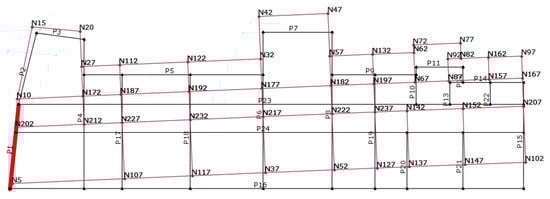 Non-linear static pushover analysis [39,40] allows us to check the overstrength ratio used in linear analysis and it gives us more detailed insight into critical elements, possible failure mechanisms, and global behavior of the building as a whole. Pushover analysis is performed with constant gravity loads and monotonically-increasing horizontal loads. Two different distributions of the horizontal loads along the structure’s height are used for the pushover analysis. The first distribution has a uniform pattern where the horizontal load is proportional to the mass of the building. The second distribution has a modal pattern where the horizontal load is distributed along with the building’s height proportionally to the first vibration mode shape of the building determined through elastic analysis (Figure 22 and Figure 23). These horizontal loads are applied at the location of the masses in the model, i.e., at each floor level in the center of masses. Moreover, accidental eccentricity is taken into account to cover uncertainty in the calculation of the center of masses of the building. The 5% of the building’s length perpendicular to seismic load direction is taken into account on each side for both x (longitudinal) and y (transverse) directions.