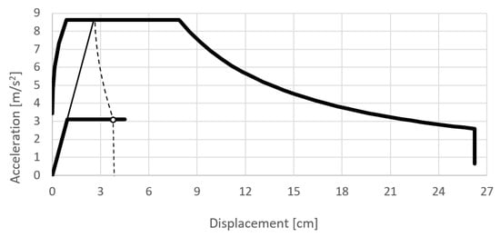 In each incremental step, internal forces are redistributed according to the element equilibrium, and stiffness is degraded in plastic range. Additionally, ductility is controlled with maximum drift which is 0.004 for shear failure and 0.008 for bending failure [34,41]. Generally, masonry walls have three main failure modes as described in [41,42,43,44]. Turnsek–Cacovic constitutive law is used as diagonal cracking is usually the dominant failure mode for existing unreinforced masonry structures [45,46]. In the work of [47], diagonal failure strength is correlated with shear strength used for Turnsek–Cacovic constitutive law. Shear strength obtained by in situ testing is compared with shear strength approximation from the visual MQI method which is explained in more detail in [48] and further developed in [49,50]. Compared shear strengths are very close for this case study which implies good precision of the MQI method. Cracked stiffness of vertical elements is used in a model as recommended in [34], so that cracking that occurs during lifetime because of expected earthquakes of a smaller magnitude is taken into account. Shear and flexural stiffness are taken as half value of initial stiffness.