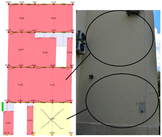The east wing was also damaged at the ground floor and 1st floor level. The cracks that appeared propagated were through the entire wall of the south facade of the wing. It is unfavorable that the cracks are joined and continue to the transversely-joined walls and lintels. The cause of such cracks can be the slight contribution of a torsional response of the building as a whole, where the boundary elements are the most loaded ones, and their failure occurs. Additionally, that part with the building is connected to the neighboring building. Although this can generally have a positive effect on the whole building, in the case of walls on the east wing, such a boundary condition can cause additional forces. If the walls are not well connected to the diaphragms by a tensile compression connection, this can cause them to fail. Since there has been no displacement of the wall out-of-plane, it is not in danger of collapsing, but it should be strengthened soon, and further damage propagation should be prevented. Minor damage in the form of cracks on the walls can be seen on the west and east staircases.