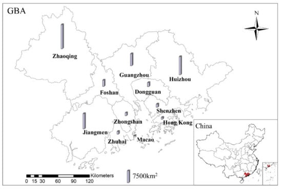 The location of the GBA and the area of each city within the GBA.