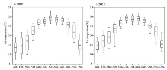 Box plots of the daily average air temperature in the GBA in 2005 (a) and 2015 (b).