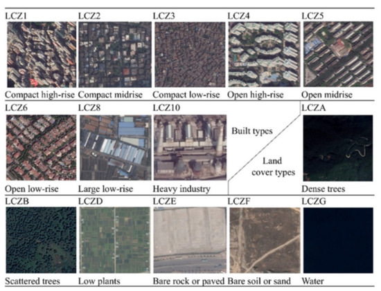 As one of the most significant changes in the development of human society, urbanization is the inevitable result of socio-economic development [1]. The variation of land use/land cover (LULC) and the enhancement of human activities in rapid urbanization [2,3] have caused changes to the urban thermal fields, which have led to the emergence of the urban heat island (UHI) effect [4,5]. The UHI effect refers to the higher temperature that occurs in urban areas compared to that in suburban or rural areas. Therefore, the UHI intensity is defined as the temperature difference between the urban and rural areas. Most current calculations of the UHI intensity are based on the urban–rural temperature differences. Urban theorists claim that the relation between city and country is more accurately described as a continuum, or a dynamic, rather than as a dichotomy [6]. The complexity of urban–rural systems and the difficulty of defining urban–rural boundaries [7,8] have brought great uncertainty to the quantification of the UHI intensity. In addition, only using urban and rural areas to describe the major differences in the urban thermal environment could result in the loss of numerous surface details (e.g., land cover, urban morphology and function) that determine the local climate differences. Hence, Stewart and Oke proposed a detailed surface classification framework for urban thermal field research named the local climatic zone (LCZ) classification scheme. LCZs are regions with uniform surface cover, structure, materials, and human activity, in a horizontal scale of hundreds of meters to several kilometers, including 10 built types and seven land-cover types. The LCZ classification scheme does not include climate factors, but is based on the attributes that affect climates, namely the surface structure (height and spacing of buildings and trees) and surface cover (pervious or impervious). The surface structure affects the local climate through its modification of airflow, atmospheric heat transport, and shortwave and longwave radiation balances, while surface cover modifies the albedo, moisture availability, and heating/cooling potential of the ground [8]. Thus, although the description of the LCZ classification is similar to the land cover or land use classification, the LCZ characteristics are more focused on climate-related factors. Being highly correlated with urban structure and the land-cover types, the LCZ classification scheme emphasizes the influence of the representative geometric properties and surface cover characteristics on the local climate [9]. As consequence, LCZs have been used to explore how urbanization affects the thermal fields of human life, mainly referring to the urban heat island (UHI) effect.