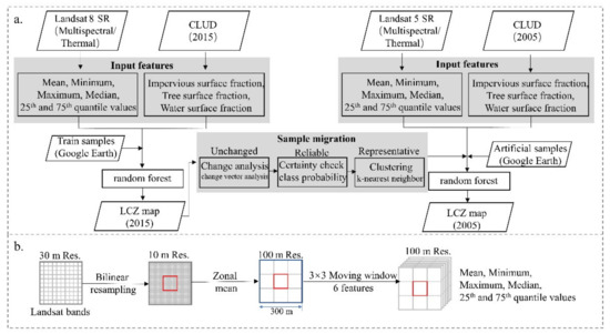On the other hand, multi-temporal LCZ mapping is the basis of dynamic LCZ analysis. To date, the method of single-temporal mapping has commonly been adopted to obtain multi-temporal LCZ maps. Specifically, the LCZ training samples with different time phases have been selected separately, and then the World Urban Database and Access Portal Tools (WUDAPT) method [27,28] or a supervised classification method [25,29] has been applied to obtain multi-temporal LCZ maps. However, because of the relatively large number of LCZ categories and the large amount of training samples required for the mapping, selecting samples for each separate classification process is a time-consuming and labor-intensive task. Therefore, this kind of sample selection method is difficult to apply for multi-temporal or large-geographic-scale LCZ mapping, especially for time phases for which samples are difficult to obtain. Moreover, this approach it is not conducive to the accurate and consistent classification of time-series images in a more automated manner. In this context, a time-series sample migration strategy is proposed in this paper to reduce the workload of sample collection and facilitate faster and more efficient multi-temporal LCZ classification.
