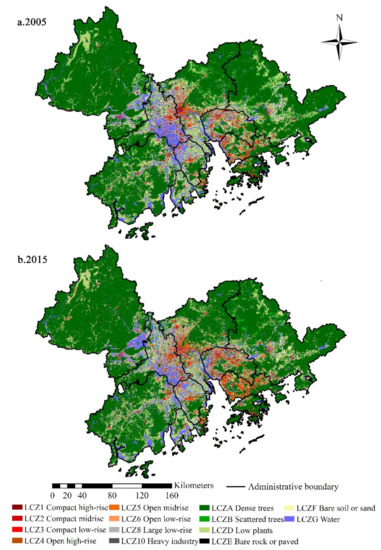 LCZ classification for the GBA in 2005 (a) and 2015 (b).