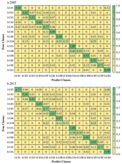 Confusion matrix diagrams for the LCZ classification in 2005 (a) and 2015 (b).
