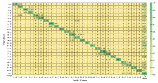 Figure 5 and Figure 6 show the LCZ maps and classification accuracies for the GBA in 2005 and 2015, respectively. The results demonstrate that reliable accuracies are achieved for the LCZ classification in the GBA, with an overall accuracy of 85.03% and 85.28% in 2005 and 2015, respectively, and a Kappa coefficient of 0.84 for both 2005 and 2015. There are 13 categories of LCZ types detected in the GBA. Theoretically, the 13 classes involve 156 (13 × 12) change transition types but, in fact, only 25 change types occur. Some change categories are rare, e.g., buildings (built types) to LCZG (water) or vegetation (LCZB/D), LCZG (water) to LCZA (dense trees), and compact high-rise buildings (LCZ1) to other types. Due to the large number of change categories and the distinct areas of some change types, approximately 30 samples were randomly selected for each change transition type to ensure that the test samples could cover all the change types, with a total of 738 samples. The overall accuracy of the change detection is 76.83% and the Kappa coefficient is 0.759 (Figure 7).