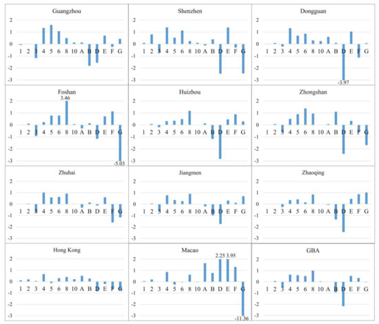 Figure 8 shows the percentage of the LCZ area changes in the total area from 2005 to 2015, indicating the degree of the LCZ area changes. As shown in Figure 8, the area of the built types (LCZ1–10) in the GBA shows an increase of 2.38% from 2005 to 2005, among which LCZ8 (large low-rise) shows the largest increase in area of 1.01%, followed by open buildings (LCZ4, LCZ5 and LCZ6), while LCZ3 (compact low-rise) is the only built category that shows a decrease, of 0.51%. Among the land-cover types (LCZA–G), the largest area change is in LCZD (low plants), which shows a significant reduction, and accounts for about 2.17% of the total area of the GBA.