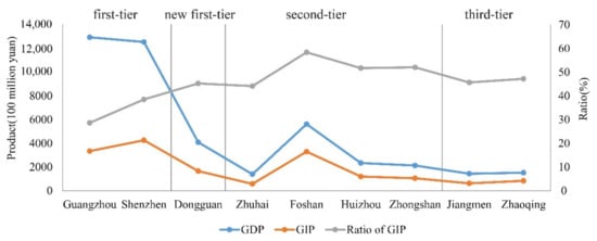 The growth of gross domestic product (GDP) and gross industry product (GIP) in the inland cities of the GBA from 2005 to 2015 and the ratio of GIP to GDP in 2015.