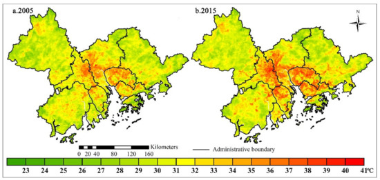Average LST of July to August in 2005 (a) and 2015 (b) in the GBA.