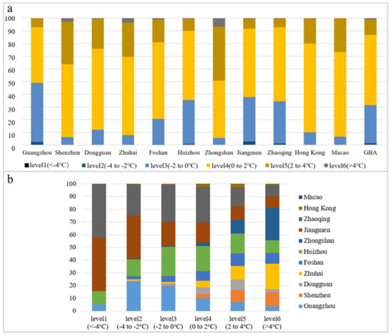 The LST change levels by cities (a) and the composition of the LST change levels in the GBA (b) from 2005 to 2015.