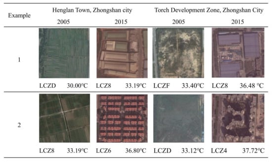 Examples of changes in the LCZs and LST from 2005 to 2015 in Henglan Town and the Torch High-tech Industrial Development Zone of the city of Zhongshan.