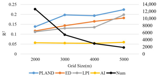 In addition, it is commonly recognized that the grid size can have a significant influence on the relationship between temperature and urban surface structure, so a suitable analysis cell is crucial for the study of the spatial characteristics of the SUHI effect [40,63,64]. Since the pixel size of the LCZ classification images produced for this study was 100 m × 100 m and the acquired MODIS LST products were 1000 m × 1000 m, the side length of the grid should be an integer multiple of 1000 m. As a consequence, the strength of the linear regression (R2 values) was used to examine the effect of grid sizes with side lengths ranging from 2000 m to 5000 m in increments of 1000 m. As presented in Figure 13, the linear regression strength (R2 values) of the model shows a slowly increasing trend with the increase of the grid size, and the peak value appears at the grid side length of 5000 m. Considering the slow increase of R2 and the sudden decrease of the sample size, it was not advisable to increase the grid size anymore. Thus, 5000 m × 5000 m was determined as the appropriate grid size in this study.