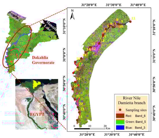 Map of Egypt showing Dakahlia Governorate and location of the studied sites (1–24) along River Nile (Damietta branch).