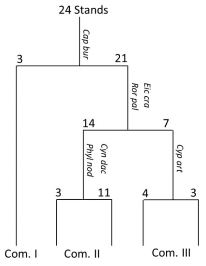 TWINSPAN dendrogram of 24 stands based on the importance value of the species. Indicator species names are abbreviated to the first three letters of both genus and species. Cap bur: Capsella bursa-pastoris, Eic cra: Eichhornia crassipes, Ror pal: Rorippa palustris, Cyp art: Cyperus articulates, Cyn dac: Cynodon dactylon, Phy nod: Phyla nodiflora.