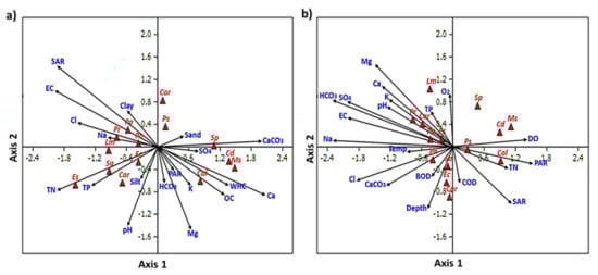 Canonical Correspondence Analysis (CCA) ordination biplot of (a) species-sediment variable, and (b) species–water variable. EC: electrical conductivity, OC: organic carbon, SAR: sodium adsorption ratio, PAR: potassium adsorption ratio, WHC: water holding capacity, DO: dissolved oxygen, BOD: biological oxygen demand, COD: chemical oxygen demand, TN: total nitrogen, TP: total phosphorus, Cd: Ceratophllum demersum, Ms: Myriophyllum spicatum, Pa: Phragmites australis, Es: Eichnocloa staginia, Ps: Persicaria salicifolia, Sa: Senecio aegyptius, Ec: Ethulia conyzoides, Pn: Phyla nodiflora, Pr: Panicum repens, Car: Convolvulus arvensis, Cal: Cyperus alopecuroides, Cart: Cyperus articulates, Lm: Lemna minor, Ss: Saccharum spontaneum.