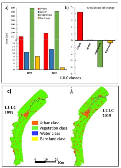 On basis of LULC maps of the River Nile Region, there are four classes: bare land, vegetation, urban and water. The results demonstrated the following: vegetation class is exhibited by areas of 791.16 km2 (86.6 %) and 711.53 km2 (77.87%), urban class is represented by 103.73 km2 (11.4%) and 188.45 km2 (20.62%), water class is mainly represented by 10.69 km2 (1.2%) and 12.48 km2 (1.37%), and bare land class occupied areas of 8.13 km2 (0.9%) and 1.25 km2 (0.14%) with annual change by −3.98, 4.24, 0.09 and −0.34 km2 in 1999 and 2019, respectively (Figure 4a,b). The study area is a part of the Nile Delta region which suffers from urban sprawl problems on account of the agricultural lands. Therefore, the annual loss of agricultural lands (3.98km2) is closely relevant to the annual expansion of urban areas (4.24 km2). The present findings coincide with [54] in the Nile Delta region. On the other hand, the bare lands lost 0.34 km2 due to the annual expansion of urban areas while non-significant change was observed in the water bodies (0.09 km2) as shown in Figure 4c. The uncontrolled urban expansion is one of the main driving forces leading to the loss of land resources and damaging ecosystems [55].
