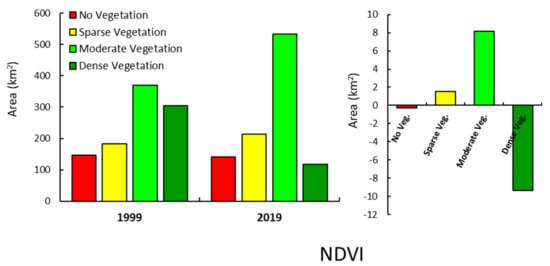 Focusing on the study area around the Nile River, a clear decline is noted in the dense vegetation of the Nile River zone by 9.35 km2 annually, as it was 304.80 km2 in 1999 and then decreased to 117.89 km2 in 2019 (Figure 5). Likewise, the moderate vegetation class showed an increase of 8.15 km2 per year (the highest increase among the four NDVI vegetation classes). It increased from 369.76 km2 in 1999 to 532.85 km2 in 2019. Sparse vegetation class was represented by scattered patches, which showed increases as they got closer to the Nile River branch. Sparse vegetation class (including the wild plants) showed an annual rate of increase by 1.5 km2 from 183.44 km2 in 1999 to 213.39 km2 in 2019. Finally, no vegetation class showed a slight decrease with 0.31 km2 annually where the total area occupied in 1999 was 147.17 km2 that decreased to 141.01 km2 in 2019 (Figure 5). Despite the loss in agricultural lands as prescribed in the LULC section, represented by dense vegetation, there are increases in both sparse and moderately dense vegetated areas. These areas are extensively associated with the newly developed urban areas. In other words, although the uncontrolled urban sprawl caused loss of agricultural lands, it leads to expansion on wild plant habitats, represented mainly by sparse class and partially by moderately dense class [56,57] as shown in Figure 7. The NDVI values show changes according to the years. The application of spectral indices provide data helping the decision-makers in the conservation of the remaining natural sustainable resources of the aquatic ecosystems.