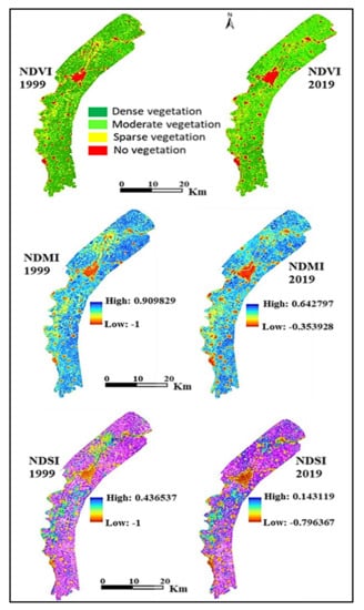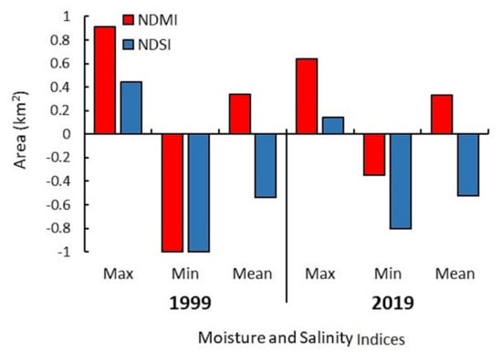 A similar pattern of results was obtained in NDMI where the minimum value was −1, reaching 0.91 with a mean of 0.034 in 1999. Then, a clear increase was recorded in 2019, as values ranged from −0.35 to 0.64 with a mean value of 0.33 (Figure 6). The increase in mean values of the moisture may arise from the increase in total areas of wild plant habitats during the investigated period (1999–2019). This might increase the suitability of conditions for wild habitats which induces the proliferation of natural plants. Disturbance arisen from the changes in land surface characteristics such as LULC, vegetation cover and moisture leads to the environmental suitability for spread out of natural habitats. This matches with the findings of El–Zeiny, El–Hefni [58]. On the other hand, the NDSI distribution map in 1999 showed noticeable variation, as the lowest value was −1, while the highest value was 0.44 with a mean of −0.54 (Figure 6). Although a noticeable decline was recorded in 2019 in the levels of NDSI ranging from −0.08 to 0.14, the mean level does not show a significant change (−0.52). This index is associated with the land affected by salinization problems which are high in agriculturally degraded land and in water as well as urban areas (Figure 7). The changeable LULC caused increases in urban areas and decreases in both bare lands and vegetation classes. This complex change might be the reason behind the stability of the mean values and the changeable minimum and maximum values [57].