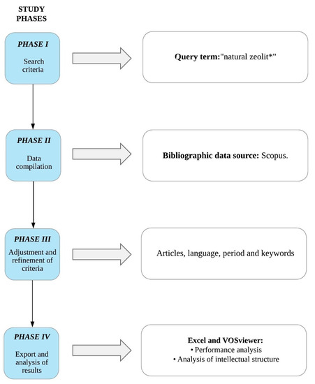 The initial data refinement was carried out using the information inclusion and exclusion criteria, by applying the type of document (article), language (English), and dates until 2020. The following search equation was utilized: TITLE-ABS-KEY (“natural zeolit*”) AND (LIMIT-TO (DOCTYPE, “ar”)) AND (LIMIT-TO (LANGUAGE, “English”)).