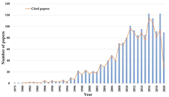 The growth trajectory of the literature on natural zeolites as environmental remedies, 1973–2020 (n = 1582).