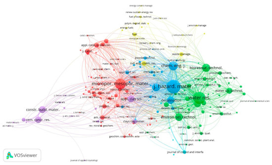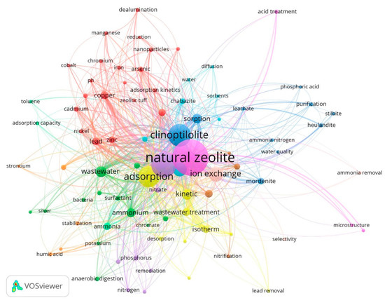 Cluster 9 (pink), called “Acid Water (AW) treatment with NZ” (see Table S1), is composed of four nodes with 690 co-occurrences, and studies the capacity of natural zeolites in the treatment of acidic waters [94], taking advantage of the adsorption properties [95], ion exchange [96] to facilitate the removal of heavy metals, and reduce pollution damage due to acid mine waters [97]. This cluster shows the main keywords, “natural zeolite”, “acid treatment”, and “microstructure”. The first of the terms mentioned, “natural zeolite”, is the nucleus of this structure, with 667 co-occurrences.