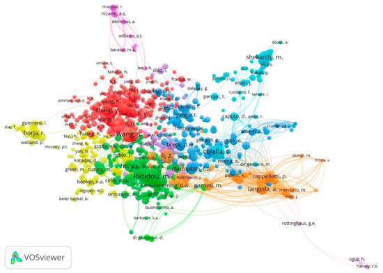 VOSviewer software was used to construct the cited authors’ co-citation map, shown in Figure 4. The intellectual structure of interest was studied (through the authors of the reference works) [69,127]; 947 authors had at least 20 citations per author, appearing in 10 clusters of different colors, with a total force of 928,935.