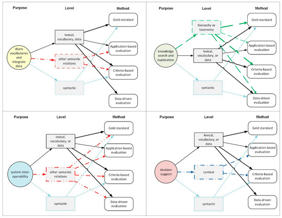 For example, the top-right quadrant focuses on the purpose of knowledge search and exploration. Ontologies focused on this purpose require the evaluation of (1) the hierarchy or taxonomy level, which can be addressed by all evaluation methods, and especially by the gold-standard and criteria-based methods (to which the lines are thicker); (2) the lexical, vocabulary, or data level, which can be addressed by all evaluation methods; and (3) the syntactic level, which can be addressed by the gold-standard and criteria-based methods.