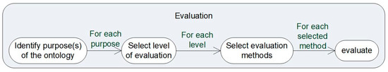 To complement the framework, we propose an iterative evaluation process, wherein we identify the ontology purposes. For each purpose, different ontology levels are selected for evaluation, and for each level, suitable evaluation methods are applied. The process is depicted in Figure 2.