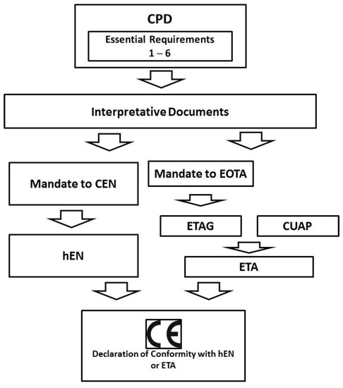 Consequently, in February 1989, the Directive 89/106/EEC (so-called Construction Products Directive—CPD) [5] was published in the Official Journal of the European Union (OJEU) as the first European piece of legislation that had been developed to harmonise the area of construction products. The objective of the CPD was ambitious, as it was intended to approximate all national provisions and procedures related to the performance and use of construction products in the whole EU area. However, this approximation was clearly not affecting the field of technical regulations for construction works, especially regarding citizens’ safety in the sole competencies of national authorities of the Member States [6].