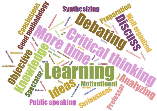 Regarding the comments of the students about the debate, after some organization of the comments by categories, we have been able to synthesize the comments in a word cloud (Figure 2) and a summary table (Table 3).