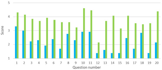 In Figure 3, we can observe the mean values corresponding to the perceived knowledge of the 13 students that participated in the debate. In blue we can see the mean values before the debate for the 20 different concepts included in the survey (Figure A5), and in green color the mean values after the debate.