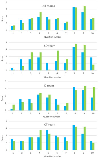 In Figure 4 we can observe the scores (from 1—strongly disagree, to 5—strongly agree) related to the first Likert-type 10 statements (Figure A3). The overall results including all students are presented, as well as the results corresponding to each team.