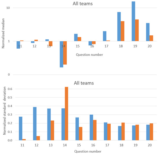 Normalized median and normalized standard deviation of the answers to the pre-post test, before (blue) and after (orange) debate. Since values are normalized, the correct answer for every question is 1.